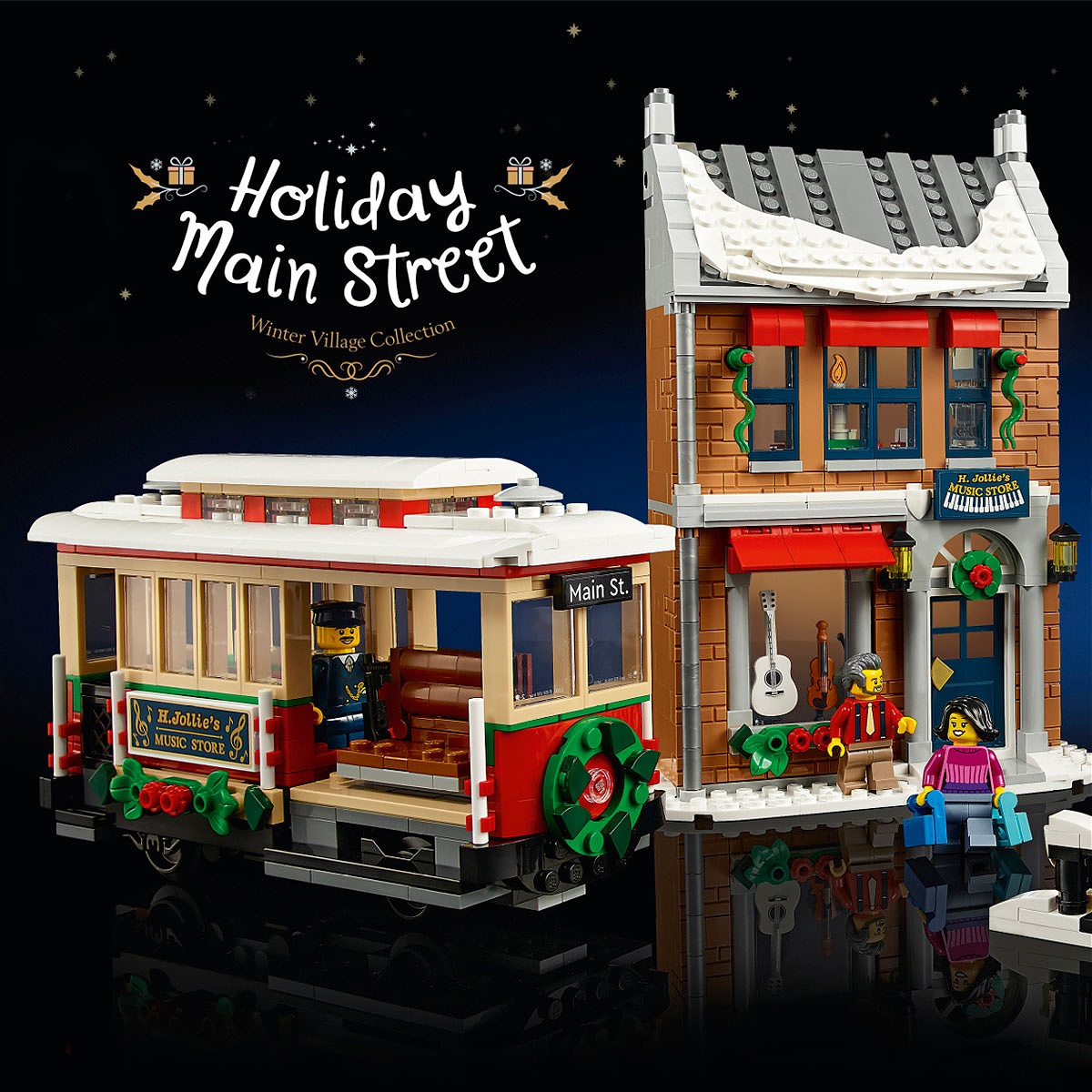 This years installment of the Winter Village collection is Holiday Main Street! Comes with 6 minifigs and 2 snow capped buildings.